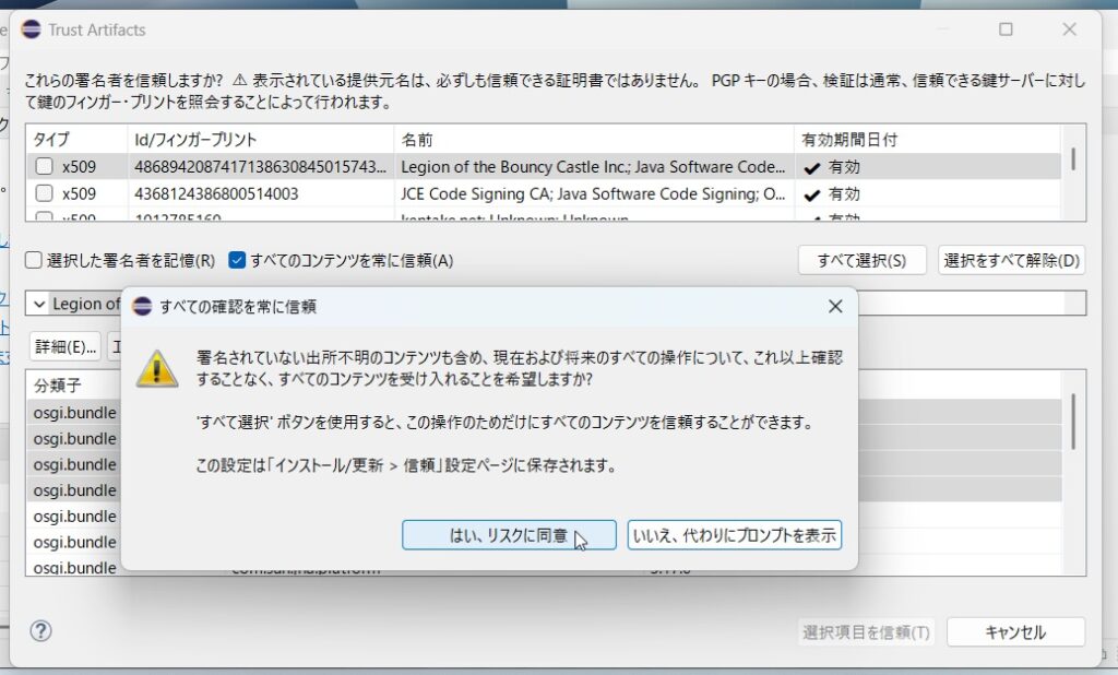 [Trust Artifacts]ダイアログに戻るので、内容をご確認の上、[選択項目を信頼]ボタンをクリックします。(次の段階にうつるまでしばらくお待ちください)。