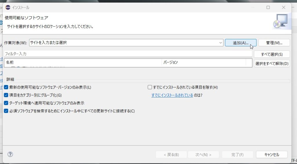 [インストール]ダイアログが表示されるので、[作業対象]の右にある[追加]ボタンをクリックします。