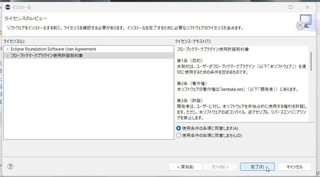 [インストール]ダイアログに[ライセンスのレビュー]が表示されます。[フローブックマークプラグイン使用許諾契約書]を選択し、右に表示される内容をご確認の上、[使用条件の条項に同意します]を選択し、[完了]ボタンをクリックします。(次の段階にうつるまでしばらくお待ちください)。
