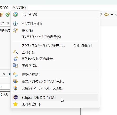 eclipseメニューの[ヘルプ]→[Eclipse IDE について]を選択します。(Pleiadesのバージョンによっては、[について]しか表示されないこともあります)。