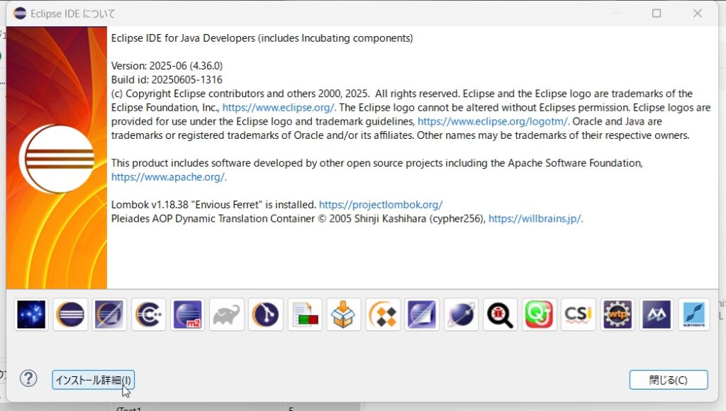 [Eclipse IDEについて]ダイアログが表示されるので、その中の[インストール詳細]をクリックします。
