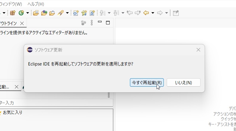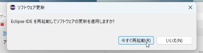 [ソフトウェアの更新]メッセージボックスが表示されるので、[今すぐ再起動]ボタンをクリックします。eclipseが再起動されて、インストールが完了します。