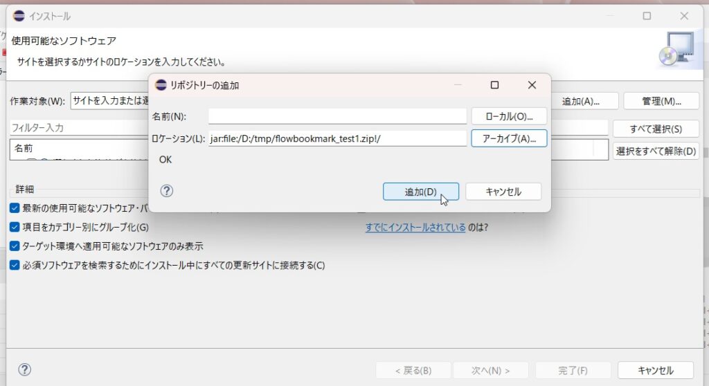 [リポジトリーの追加]ダイアログが表示されます。[アーカイブ]ボタンをクリックして、先ほどダウンロードした[flowbookmark_test1.zip]を選択して、[追加]ボタンをクリックします。