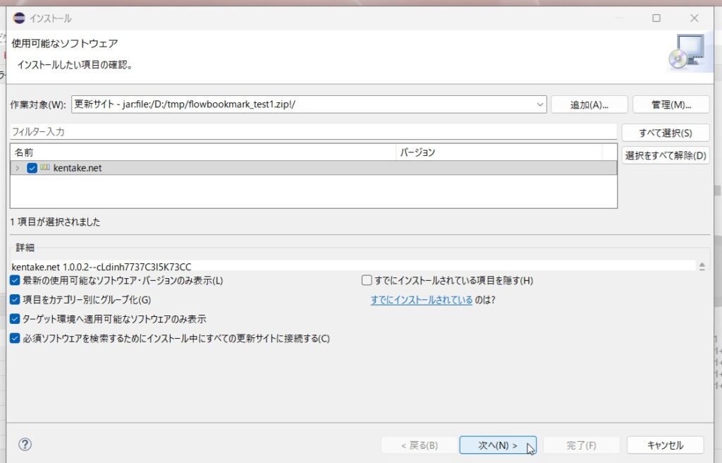 [インストール]ダイアログの[使用可能なソフトウェア]が表示されます。[kentake.net]項目が表示されますので、そこにチェックをして、[次へ]をクリックします。(次の段階にうつるまでしばらくお待ちください)。