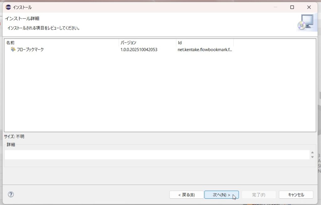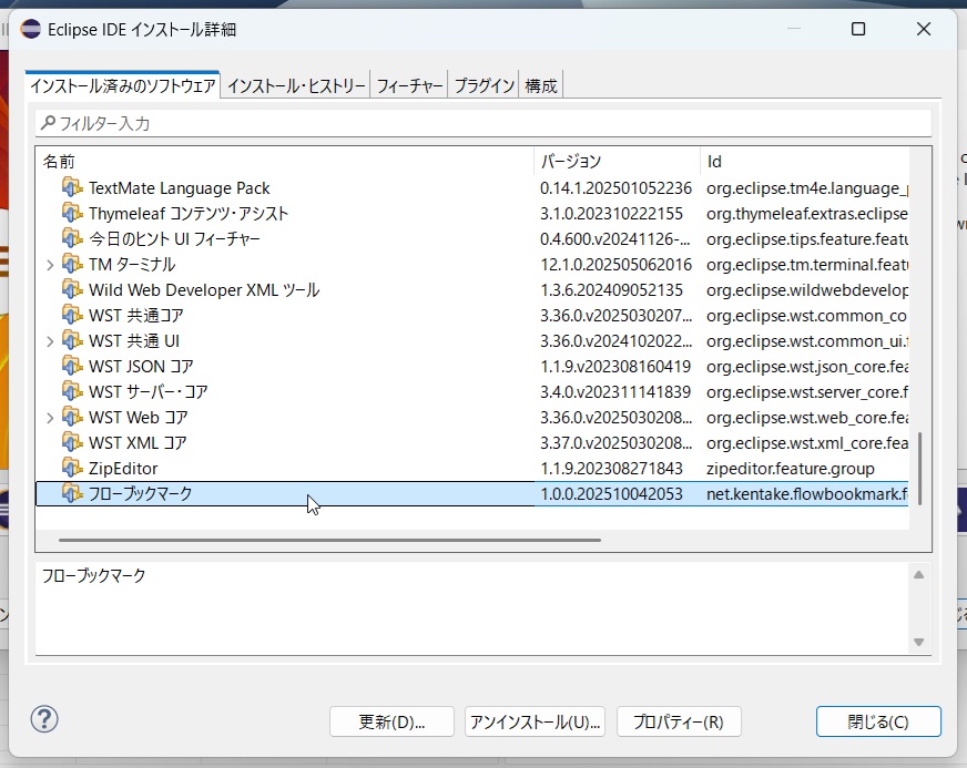 [Eclipse IDE インストール詳細]ダイアログが表示されます。[インストール済みのソフトウェア]タブを選択して、リストから[フローブックマーク]を選択します。