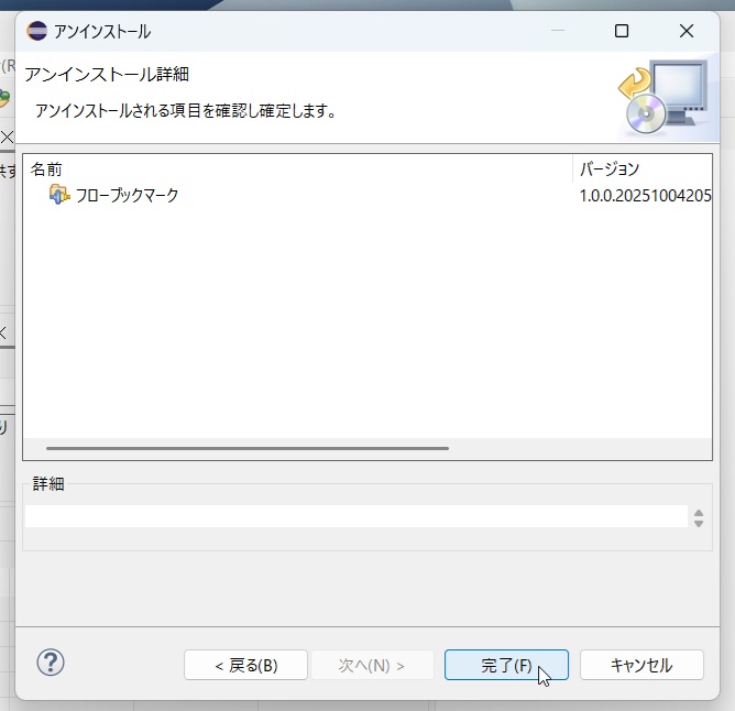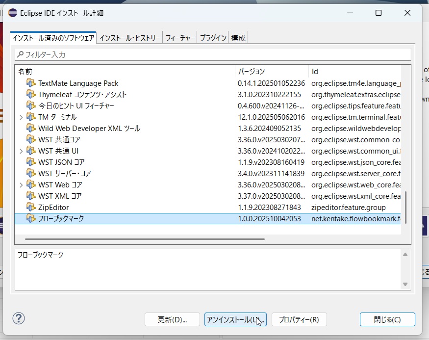 【注意】手動で、eclipseインストールフォルダ内のpluginsフォルダ内のフローブックマークプラグインのjarファイルを削除しないでください。アンインストールは以下の手順で行ってください。もし、手動で削除してしまった場合も、このアンインストール手続きを試してください。手動で削除しただけでは、アンインストールがeclipseに正式に認識されません。