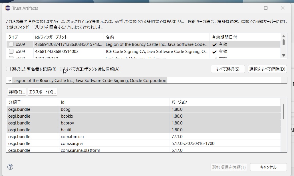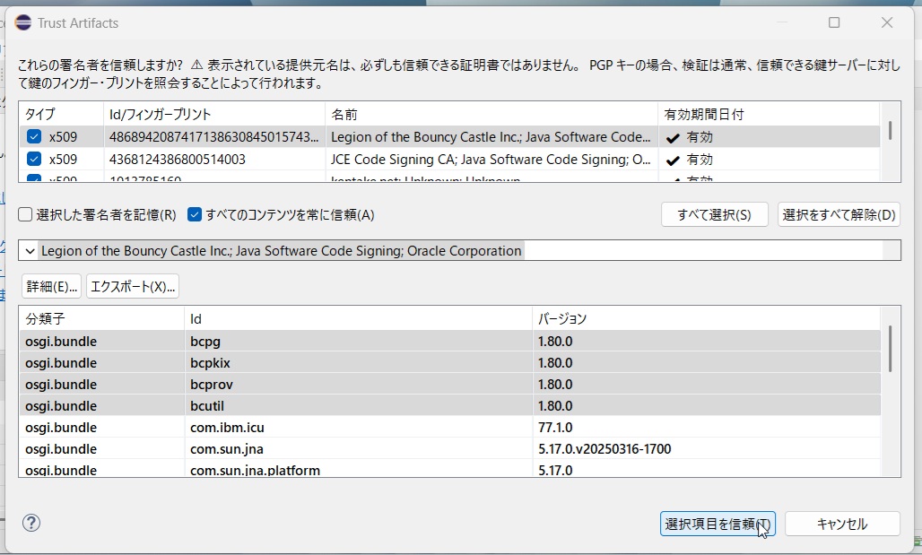 [Trust Artifacts]ダイアログに戻るので、内容をご確認の上、[選択項目を信頼]ボタンをクリックします。(次の段階にうつるまでしばらくお待ちください)。