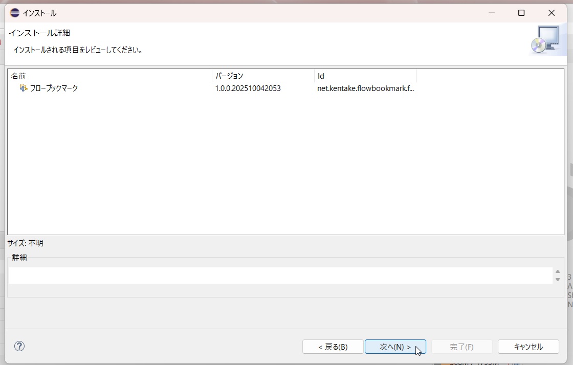 [Eclipse IDE インストール詳細]ダイアログが表示されます。[インストール済みのソフトウェア]タブを選択して、リストから[フローブックマーク]を選択します。